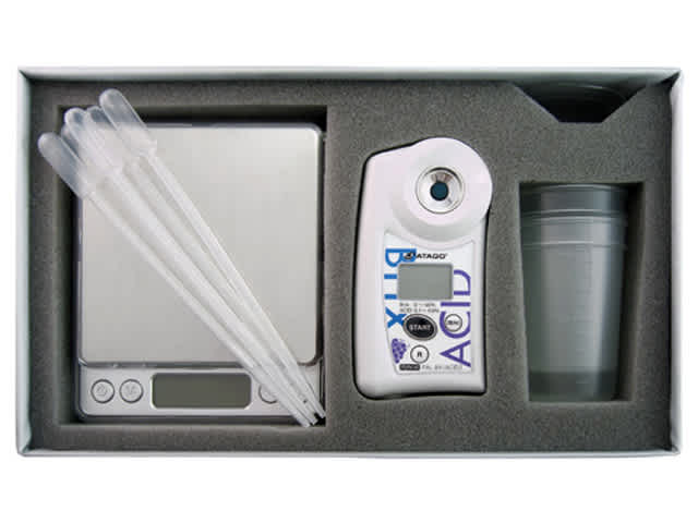ぶどう、赤ワイン、白ワインなどの糖度と酸度を測定できます。マスターキットには、天秤、ポリビーカー2個、 アタッチメント、スポイト5本、電池2本が標準付属になります。