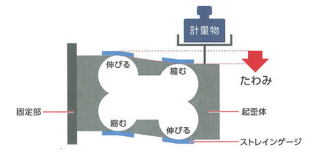 荷重を加えると、金属の歪みにより抵抗値が変化します。