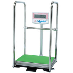 手すり付の体重計です。手すりを持ったまま測定可能な商品です。病院や、老人ホーム、介護施設にお勧めの商品です。はかりの台には滑り止めマットも使用しています。