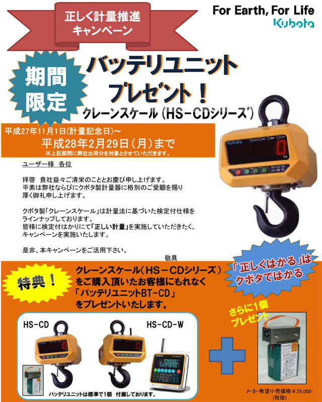 キャンペーン期間中にクボタホイストスケール®HS-CDシリーズをご購入頂いたお客様にもれなく純正バッテリユニット(¥31.320)プレゼント!※標準付属品の1個にプラスしてもう1個プレゼント、合計2個になります。