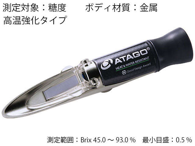 自動温度補正・防水機能付アナログ糖度計(高温対応) MASTER-93Hは 測定範囲が45.0 ~ 93.0 %です。MASTER-80H同様、ジャム、マーマレード、餡などの測定に適しています。