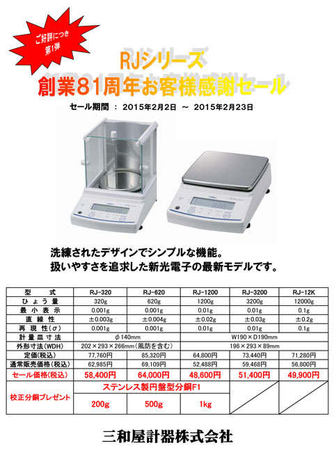 新光電子製、高精度電子天秤RJシリーズを27年2月2日から27年2月23日までの期間、セール価格で販売します。そして、RJ-320・RJ-620・RJ-1200については、なんと校正用分銅までプレゼントします。